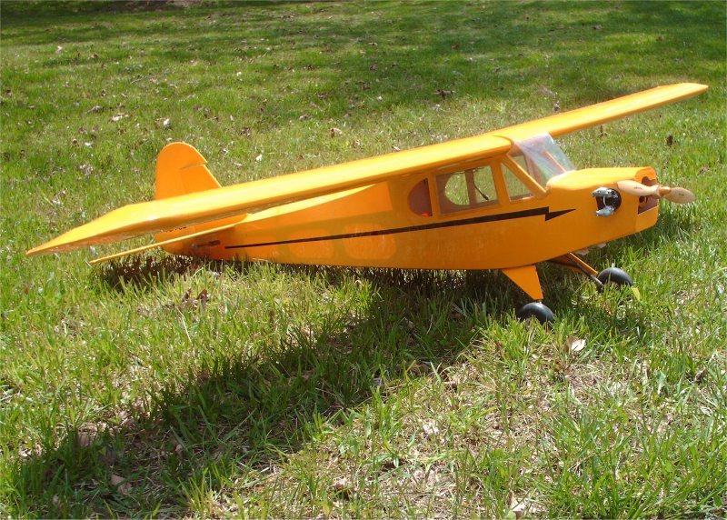 J-3 Piper Cub: Built from Goldberg Anniversary Edition kit. Power comes from a Tower Pro 3520 ourunner brushless motor with a 50A ESC. Four channels [ ailerons(1 servo), elevator(1 servo), rudder(1 servo), throttle(ESC) ] FLYING |