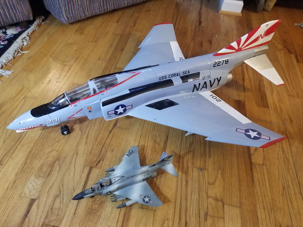 E-Flite F-4 Phantom : Fiberglass ARF, 80 mm electric ducted fan, 150A ESC, DF32 brushless motor, Six channels [ ailerons(2 servos), flaps (2 servos), elevator (1 servo), rudder (1 servo), retracts (electric), throttle (ESC) ] Pictured with 1/48 scale plastic model F-4 Phantom. |