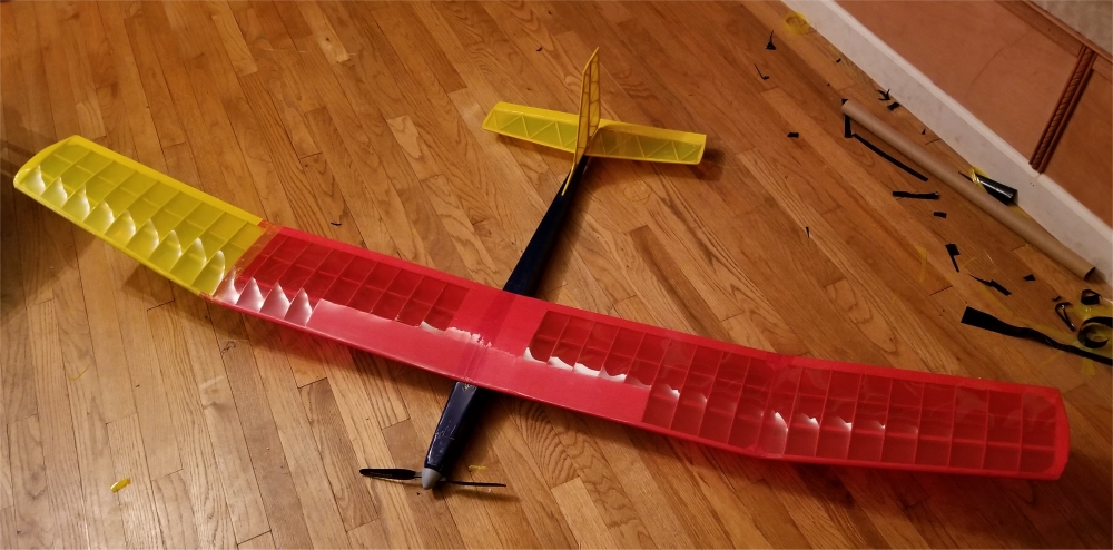 Gentle Lady LED : Built from a kit in 2018. This is powered by the same combination of DYS 2826-1000 outrunner, 30A ESC, and folding prop as the Olympic 650 above. There are 2 meters of high density white LEDs inside the wing with clear red and yellow covering, and the fuselage has white, yellow, red, and green LEDS along the sides. Two meter wingspan electric glider, three channels [ throttle (ESC), rudder(1 servo), elevator(1 servo) ] FLYING |