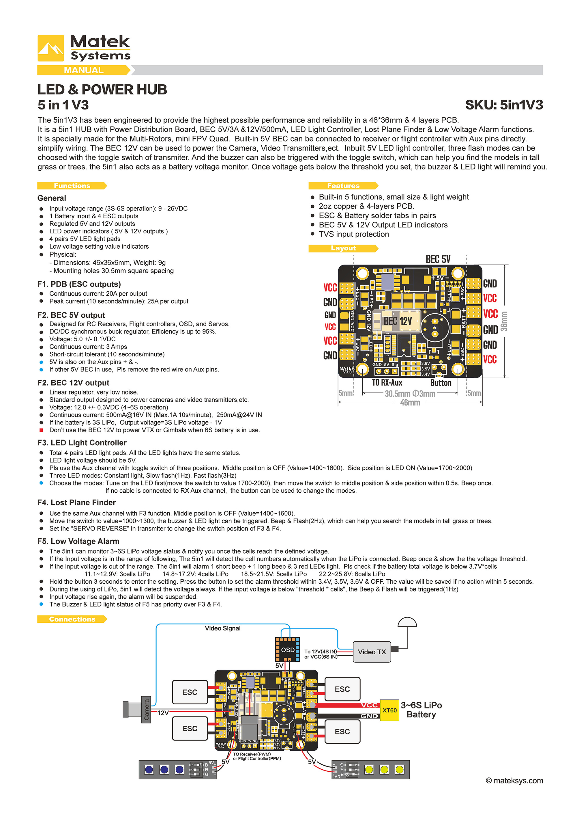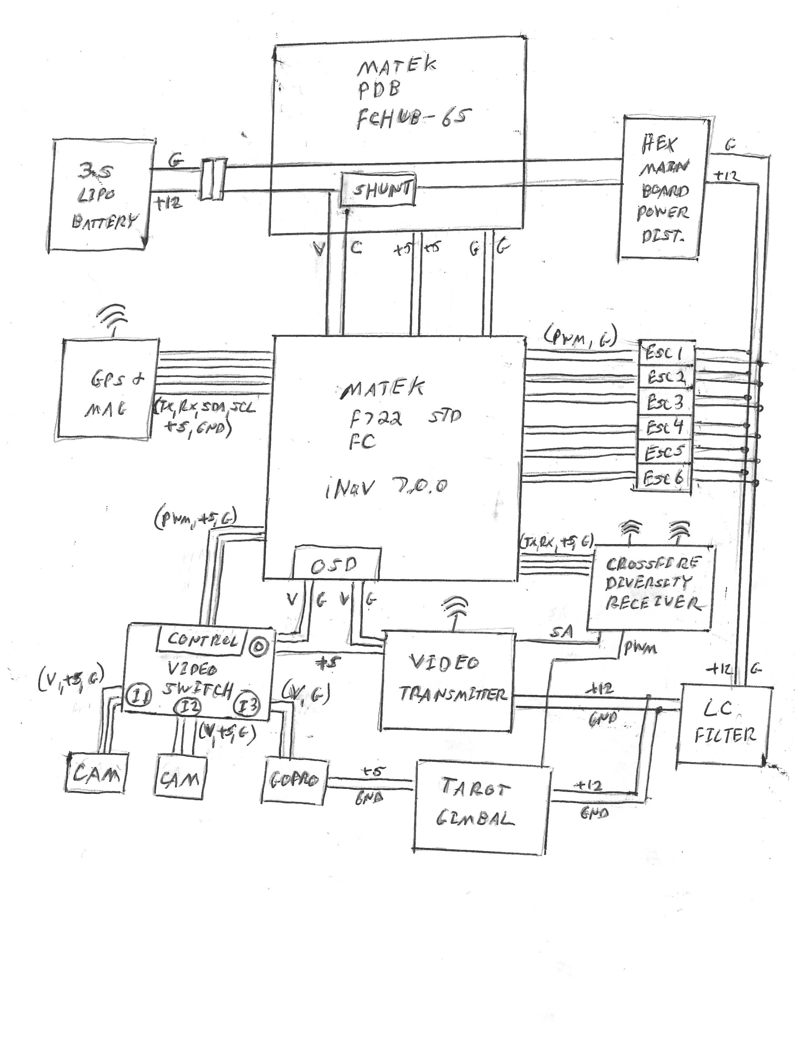 Hexacopter with Camera Gimbal - This originally flew with a KK 2.1 hardcase flight controller to test out the motors, ESCs, and frame. It now has a Matek F722 STD flight controller running iNav 7.0.0, with a uBlox 7 GPS receiver and magnetometer. The Matek F7 FC has 7 PWM outputs; PWM 1 - 6 (OneShot125) control the ESCs, and PWM 7 controls the video switch. The Tarot 2 axis brushless gimbal is independently stabilized in roll and pitch, with additional manual pitch control received directly from the Crossfire receiver. The gimbal holds a GoPro Hero 3. There are also two fixed 5V cameras and a video switch to allow selection of three different views: gimbal stabilized GoPro / fixed camera - front / fixed camera - rear. The video transmitter and gimbal are powered from the main battery through an LC filter, the control avionics are powered from a Matek PDB paired with the Matek F7 flight controller, the GoPro is powered from a dedicated 5V supply on the gimbal control board, and the fixed 5V cameras are powered by a 5V supply on the video transmitter. FLYING - FPV