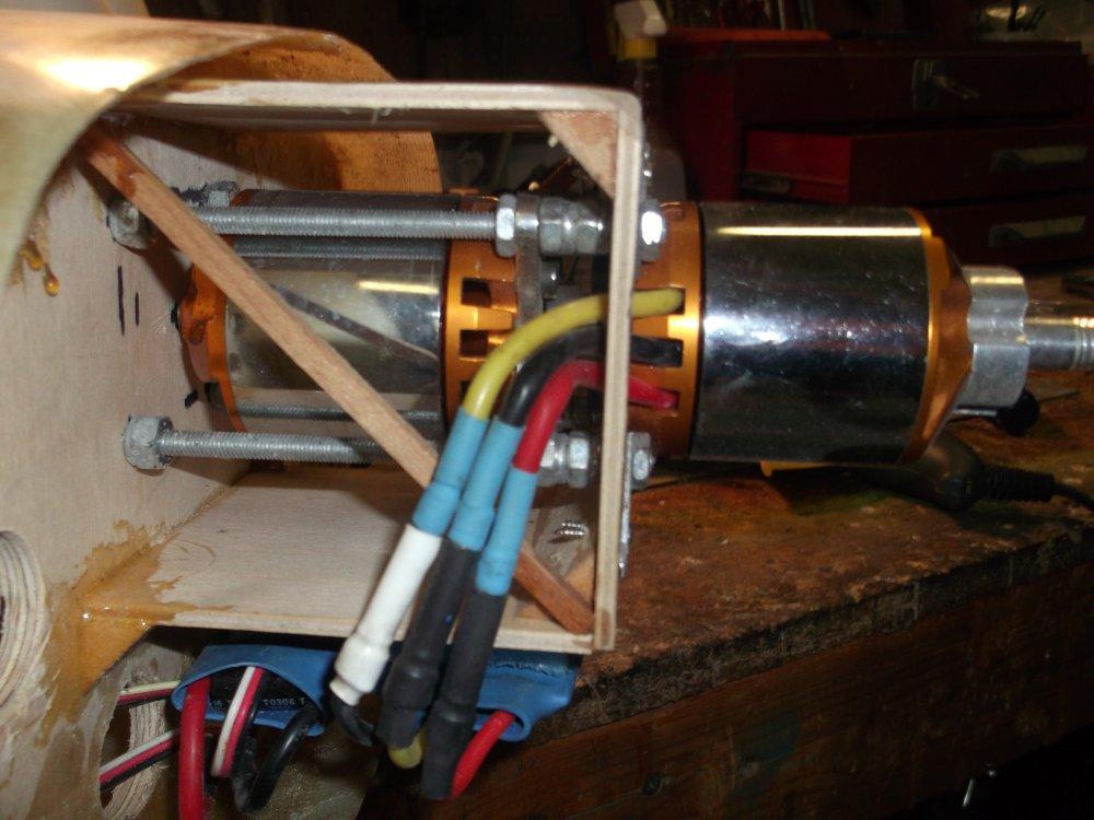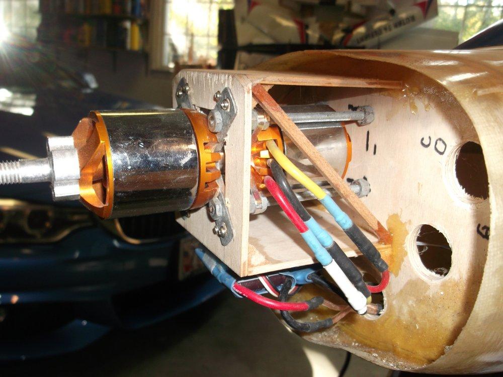 Great Planes Extra 300S : Kit built, 600 outrunner, 100A ESC, Five channels [ ailerons(2 servos), elevator (1 servo), rudder (1 servo), throttle (ESC) ] These photos show a good method for mounting a brushless motor within a large cowl. I use adjustable threaded rods to get the position correct with respect to the cowl and thrust-line, and then add in spruce cross-bracing for solid positioning and no twisting under the torque of swinging a large propellor. |