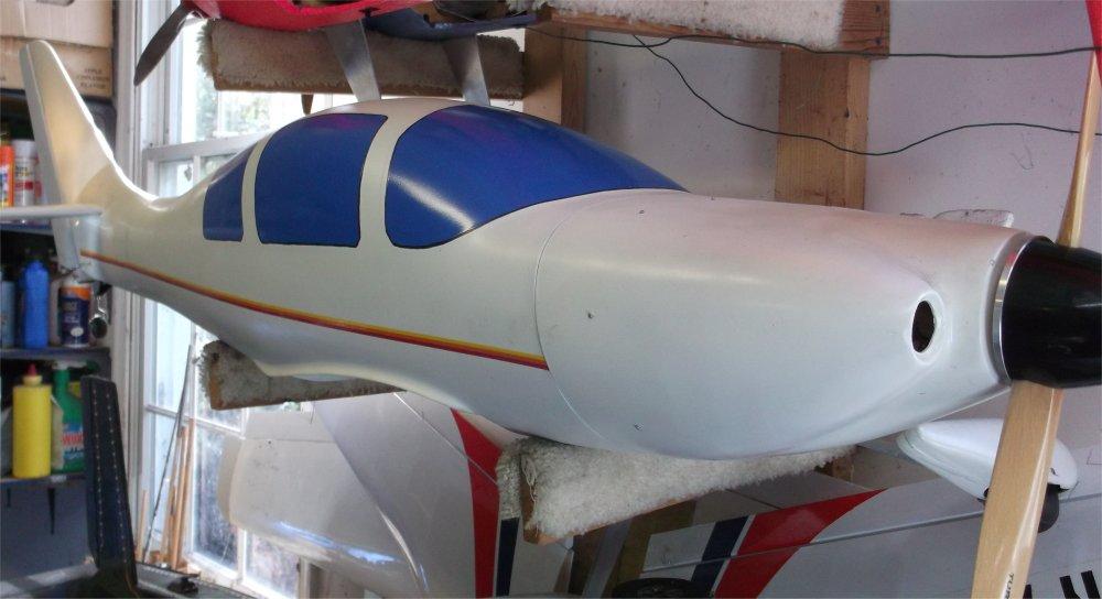 Lancair : I bought a raw fiberglass fuselage and wing foam cores at a swap meet, and built this. The power comes from two 60 size outrunners that are joined together on a single drive shaft, turning a 18x10 prop. Dual motor photo 1, photo 2. The motors were bought on line; the magnets had come off and the original owned did not want to fix the motors. I used JB Weld to re-glue the magnets to the cans, and they work great. Each motor has its own identical 70 amp ESC, and everything is connected with a home-made custom wiring harness that includes dual fail-safe safety plugs, and a large BEC from the 6S 5000 lipo battery to provide power to the RC system. Finished in white Krylon and Monokote. This plane looks and flies great. Four channels [ ailerons(2 servos), elevator(1 servo), rudder(1 servo), throttle(ESC x2) ] FLYING |