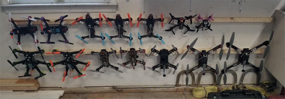 Flight Controllers - I have almost 50 flight controllers in my FPV airplanes and multi-rotors. My fixed wing FPV aircraft use flight controllers running iNav, and my multi-rotors use flight controllers running BetaFlight, with several different types of F1, F3, F4, and F7 flight controllers: Naze32 F1, Flip32 F1, Fusion Vortex F1, CC3D F1, Flip32 F3, SP Racing F3, Omnibus F4, CL Racing F4, Furious Racepit F4, Matek F7, and Aikon F7. See this page for details on all these flight controllers. |