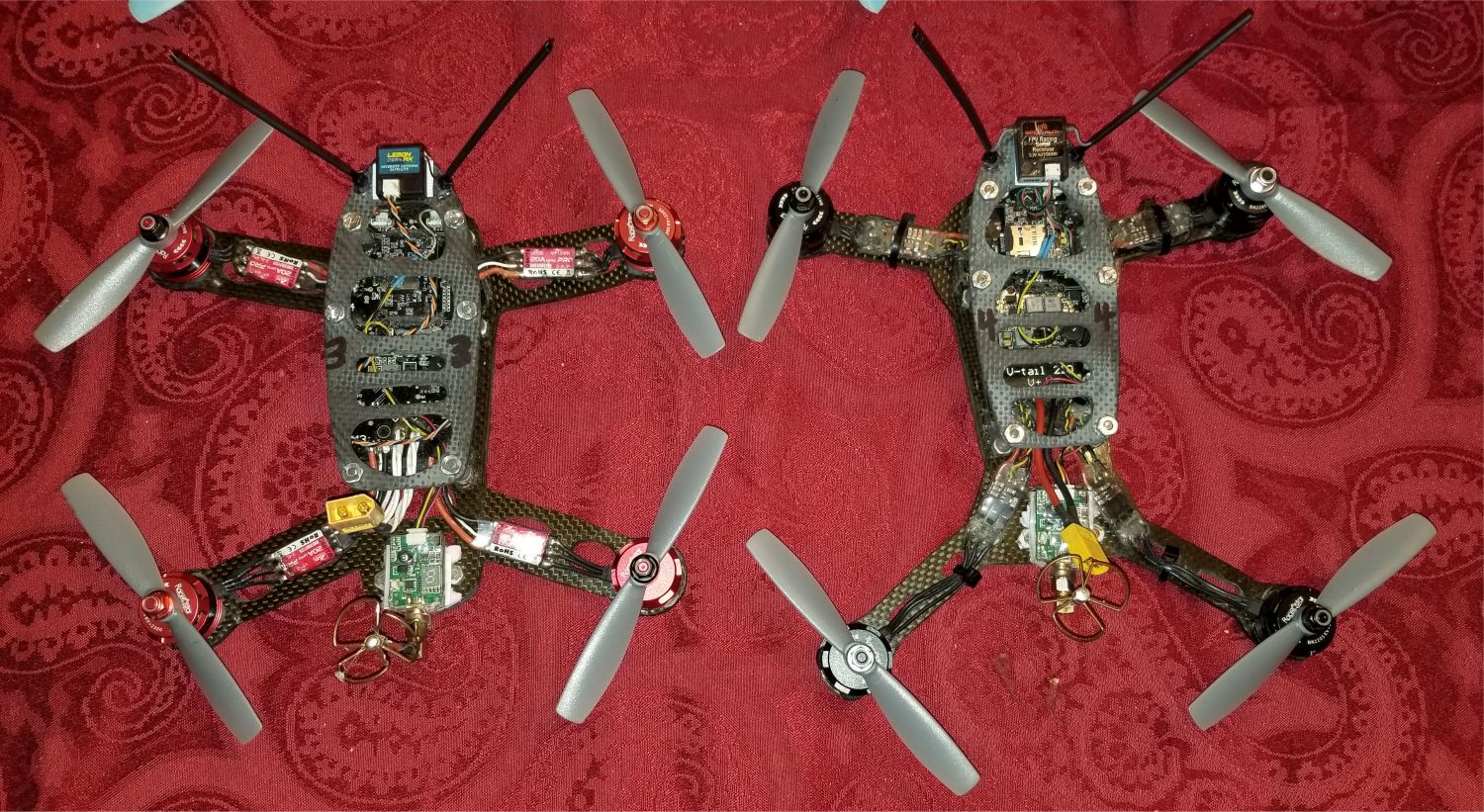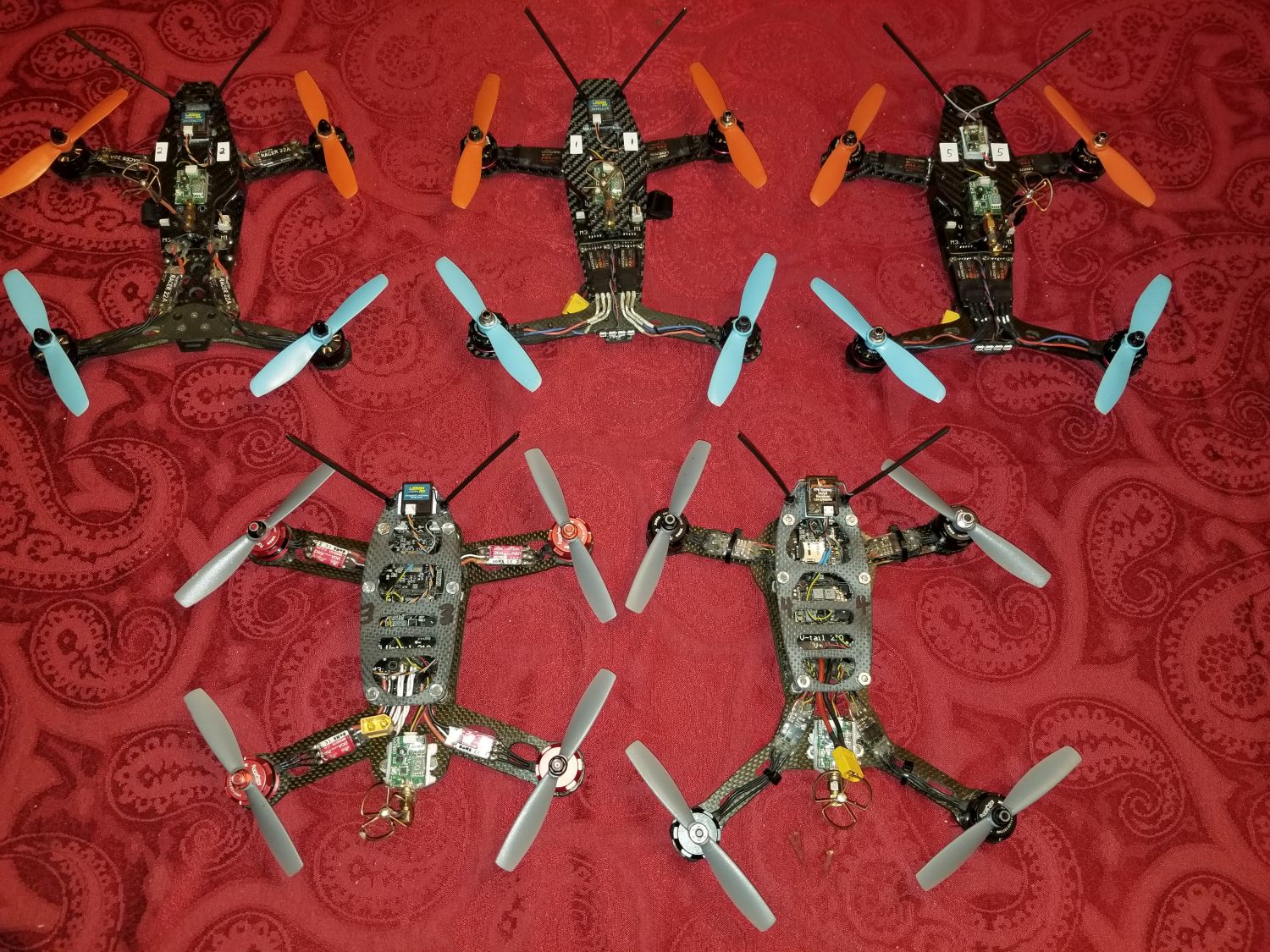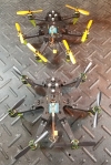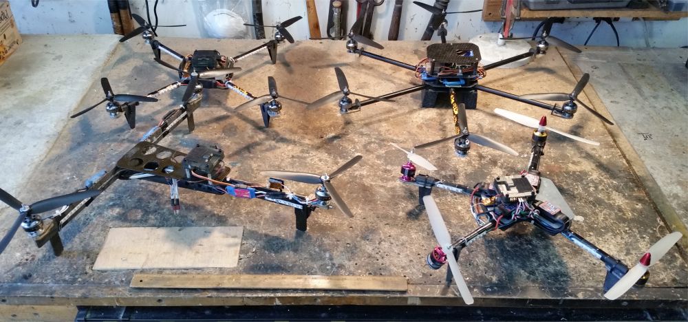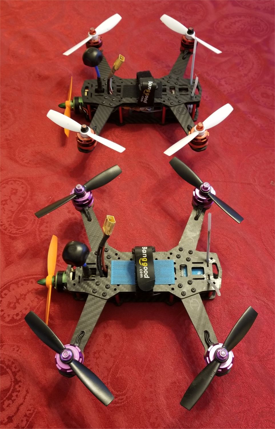 Eachine V-Tail 210 Quadcopter #1 - #5 - Banggood had a great sale for this quadcopter; it was $72 for everything to fly except the receiver, and that even included a 2-4S charger. This airframe has several issues in its stock configuration, including the problem that the v-tail assembly breaks easily. I made several changes, posted in detail here to RCGroups. I removed the plastic v-tail assembly and extended the arms with carbon fiber to make a standard flat X platform without the v-tail. I removed the camera/DVR combo to go on another airframe. I swapped out the 200mW video transmitter for a higher power model. I also bought a second frame and flight controller from someone at RCGroups for $15 and built a copy of #1, with similar motors and ESCs. Both copies have the same flight controller, camera, and video transmitter. I later bought two more sets of the FC + PDB/OSD to build versions #3 and #4 below, and then later bought another complete quadcopter from someone at RCGroups who could not get it to fly well. I made the same modifications I had made to #1 and #2, and now have a fifth copy. ALL FLYING - FPV