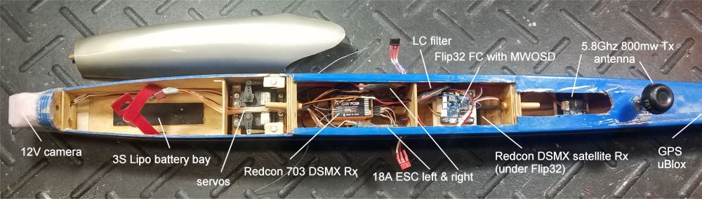 Paragon FPV - Flip32 F1 FC with MWOSD - I built this three meter wingspan glider from a kit in 1988. I converted it to electric power in 2009 with twin 2410 outrunners and 18A ESCs. I added FPV equipment in 2017, and updated the radio to Crossfire in 2024. Five channels [ left & right motors(ESCs), rudder(1 servo), elevator(1 servo), flight controller modes (3 aux channels) ] FLYING - FPV Flip32 F1 flight controller all-in-one (AIO), MWOSD 2.0 SW - barometric pressure sensor for altitude, current and voltage sensors - flashed and configured special compile of iNav 1.7.2 via USB - flashed and configured MWOSD 2.0 via USB with MWOSD 2.0 Configurator - COM1: MWOSD (shared with USB) - COM2: Crossfire uplink commands, downlink telemetry - COM3: GPS 5 hz update, soft-serial @ 9600 baud (yes, this works, and the GPS is reliable) Crossfire Nano Receiver (replaced Redcon 703 receiver shown in photo) - use TBS LUA scripts to configure Rx output channels - Rx channel 1 & 2 : Crossfire Tx/Rx - Rx channel 4 : SmartAudio - controls video transmitter via Crossfire LUA scripts on TX16S transmitter - RC channel 8 is set to output Crossfire LQ/RSSI as signal, flight controller reads channel 8 for RSSI in video overlay TX1811 800mw 5.8 GHz video transmitter - SmartAudio is connected to Crossfire receiver to allow video transmitter control from TX16S transmitter uBlox GPS Cyclops camera/DVR gets power from a 5V regulator (replaced 12V camera shown in photo) LC filter for power to flight controller/OSD, camera, and video transmitter for clean video
