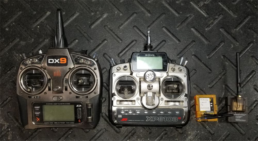 RC Transmitters - I have used Futaba, Airtronics, JR, and Spektrum radios through 35+ years of flying RC. I started using 2.4 Ghz radios in 2010, and sold my remaining 72Mhz radios in 2018 when I went to only 2.4 GHz Spectrum equipment. I currently have a Spectrum DX9 as my primary radio, and DSMX receivers in many of my aircraft. I use a RadioMaster TX16S transmitter with a 4-in-1 internal RF section and Crossfire external module for my FPV aircraft and multi-rotors. These long range FPV aircraft are equipped with Crossfire receivers: 6' Travel Wing, 5' Travel Wing, Caipirinha Wing, NanoTalon, Reptile 800 Wing, 10" Long Range Quadcopter, Hyperlow 5" Quadcopter, Cycle Glide 5" Quadcopter. I also have a JR XP8103 transmitter with an Orange UHF 915 MHz OpenLRS-NG UHF 1 watt long range transmitter module for my long range FPV aircraft. My XP8103 transmitter is also modified with a discrete switch setup on channel 8, used to command multiple flight modes in the flight controller software I use for my FPV aircraft. See my RC electronics page for full details on how to build this switch setup. |