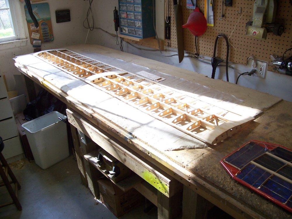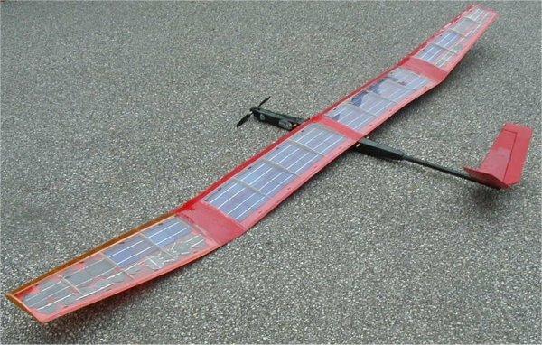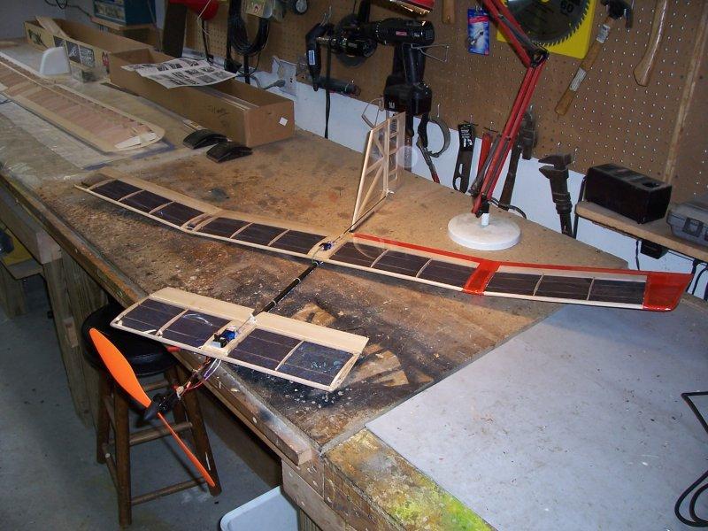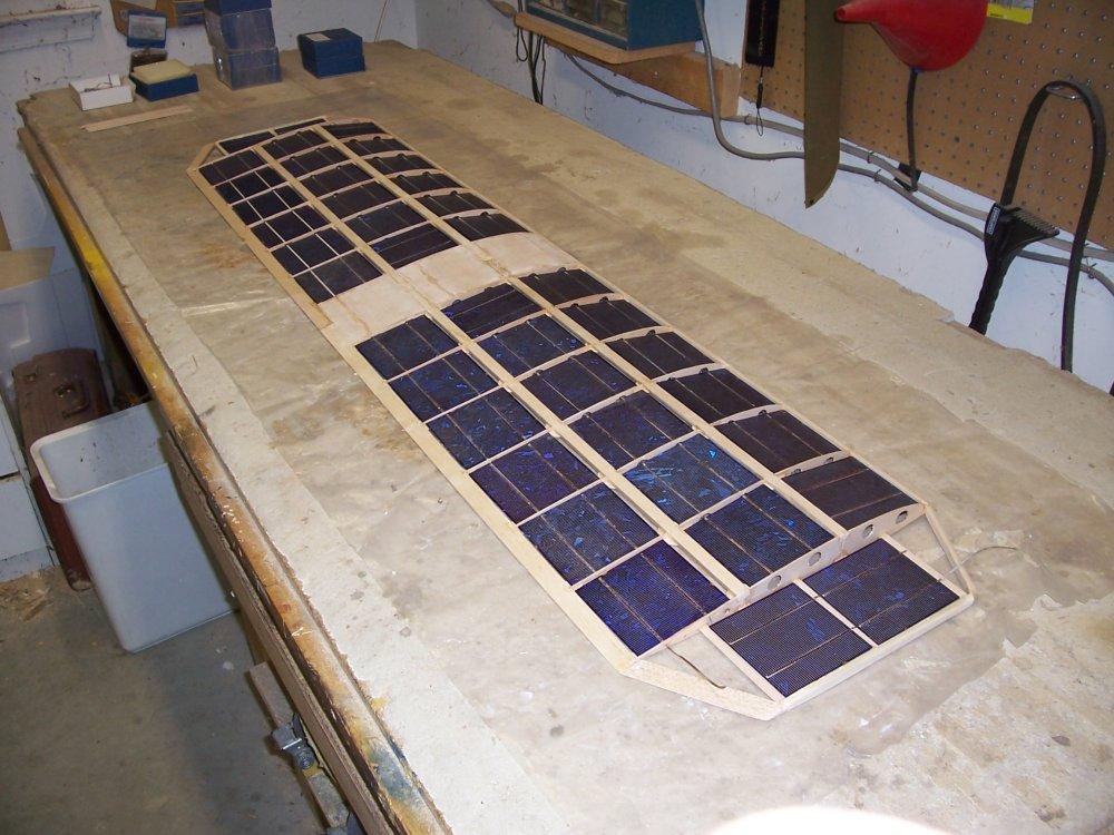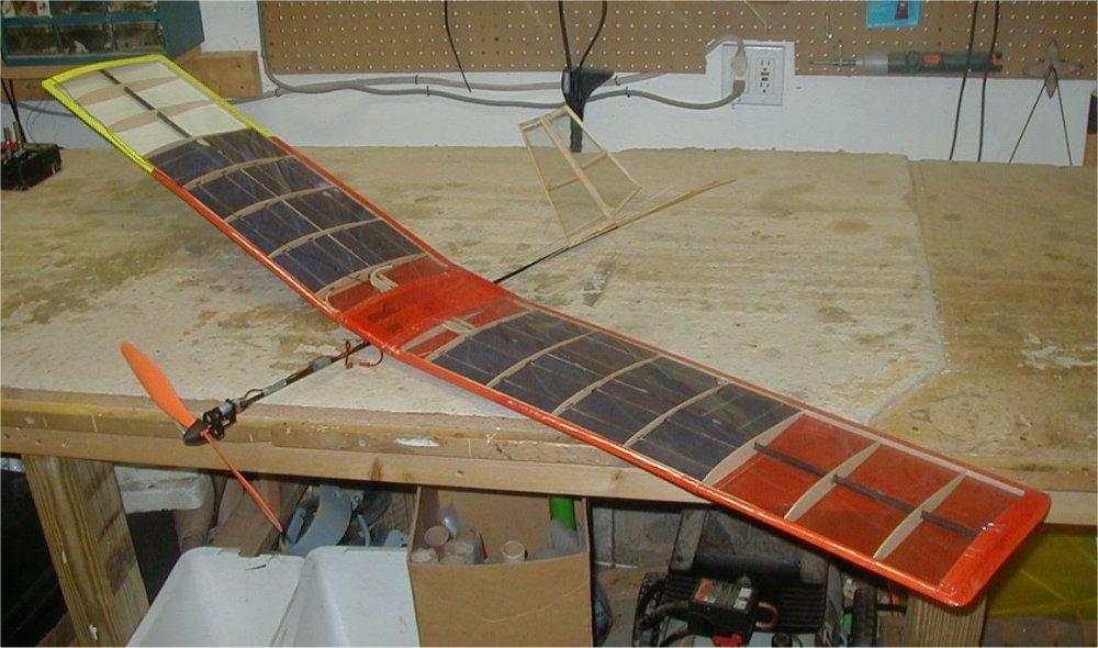 Solar Powered Electric Glider Test Aircraft I am building a four meter wingspan plane to attempt to set two world records for solar powered remote control aircraft; longest straight line distance and greatest altitude gain. The two planes shown in the first two photos were the test-beds for solar testing. The first plane had a four meter span with 48 watts of solar cells and was powered by a brushed speed 600 motor. The second plane had a one meter span with 16 watts of solar cells and was powered by a GWS IPS 100. Both planes have been cannibalized for solar cells and disassembled. The structure of the larger plane was built too light and the smaller plane was built too heavy. FLOWN - retired Solar Powered Electric Glider Canard Mini-size The third photo shows the mini test version of the design I have gone to for my solar project. It contains 16 solar cells, measured at 9.2 volts open circuit and 2.1 amps closed circuit in bright sunlight. IPS 100 geared motor, 4 amp ESC, 3 channels [ rudder(HS-55 servo), elevator(HS-55 servo), throttle (ESC)] Under Construction Solar Powered Electric Glider Canard Full-size Based on the results from the test aircraft and the design of the smaller solar canard, I have a new wing and fuselage setup that holds 140 watts of solar cells. The canard section, shown to the right with solar cells installed, holds 40 watts of solar cells. The main wing, with the center section shown to the right with no solar cells, holds 100 watts of solar cells. The final assembly will resemble the small solar canard above, but will be four times as large. Under Construction |
