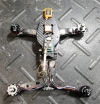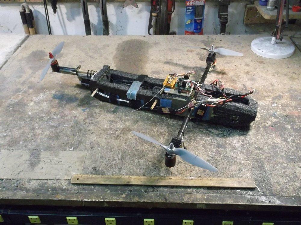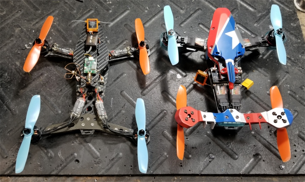 Pentacopters 2205 #1 and Pentacopter 2205 #2 - This is a regular QAV 250 quad frame with a fifth motor on the back acting as a pusher. This allows the quad to fly forward in level pitch with hover power on the four main motors, with the rear motor providing the forward thrust. I have the frame turned upside down to keep the four main motor props up high, away from the rear pusher prop which I have mounted low. FLYING - FPV QAV 250 carbon fiber frame Afro CC3D F1 flight controller with 4-in-1 20A ESC, 3-4S input, manual - flashed BetaFlight 3.1.7 with FTDI serial adaptor on flight controller COM1 - configured BetaFlight via USB - configured ESCs with BlHeli via FC pass-through - uplink commands from DSMX receiver via PPM Racerstar 2205-2300 motor (x4) - vertical lift Multistar Elite 2205-2350 motor with built in 30A ESC - rear motor as pusher for forward flight Orange 617XL DSMX PPM Receiver - channel 5 : arm/disarm + flight modes - channel 6 : motor #5 (pusher) MicroMinim OSD - flashed and configured MWOSD 2.0 via FTDI with MWOSD 2.0 Configurator Eachine TX526 25/200/600mW 5.8GHz video transmitter 1000 TVL camera LC filter, supplies power to video transmitter + camera + OSD |