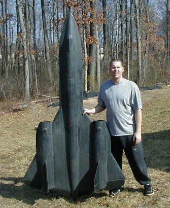 1/12 Scale Lockheed SR-71 Blackbird - Built from plans. 102 inches long, 30 pounds - (2) OS 91 VR-DF with tuned pipes, Dynamax fans, pneumatic retracts, seven channels [left elevator(2 servos), right elevator(2 servos), left aileron(2 servos), right aileron(2 servos), rudders(2 servos), nose steering(1 servo), throttle(1 servo), retracts(1 servo)] The photo to the left shows me, 6'4" tall, standing next to the 8'6" long Blackbird for a size comparison. The photo to the right shows my three big wings with the Blackbird, which makes the Blackbird look small. The wings are 11', 13', and 16' across. |