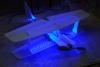 Night Trainer LED : Built from scratch. This was originally powered by an OS 61 SF, then converted to electric power with a 60 size outrunner and a 70A ESC. The original covering was stripped, and hundreds of LEDs were added inside the wings and on the fuselage. I have eight super bright LEDs installed below the wing leading edge and one more below the nose. These super-bright LEDs are flashed in sequence like the NightRider car. All the LEDs are controlled by a home-made LED sequencer that is commanded via an RC channel from the ground. See this page for full details on the LED electronics. Five channels [ rudder(1 servo), elevator(1 servo), ailerons(2 servos), throttle(ESC), LED controller(12C508 PIC) ] FLYING |
