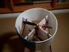 UFO-Blue LED : Flying disk covered with LEDs for night flying. I built a 36" diameter version of a plane similar to this one, from this thread at RCGroups. Check out this page to see the LEDs and how to set up LEDs. There are total of 150 super bright LEDs on the plane, along with six super-bright LEDs and a circular LED sequencer controlled by a PIC, decode counter, and inverters. The circuit and PIC code is available on the LED page. 450 outrunner, 30A ESC, five channels [ elevons(2 servos), throttle (ESC), LED flash mode, LED flash rate ] FLYING UFO-Pink LED : I copied the UFO-Blue, and made a new set of LED flashing lights with a different flashing sequence and different colors. There are fixed LED strips, and 8 super-bright LEDS facing down. The super-bright LEDs are controlled by a PIC 12c508 reading two channels from the RC receiver and driving 4 TIP120 transistors. The circuit and PIC code is available on the LED page. 450 outrunner, 30A ESC, three channels [ elevons(2 servos), throttle (ESC), LED flash mode, LED flash rate ] FLYING Both UFO's are controlled via Lemon Stabilizer Plus receivers, with three flight modes: gyros off (manual), gyros on (rate mode), auto-level (gyros + accelerometers). Gain adjustment is on a separate channel for adjustments while flying. |