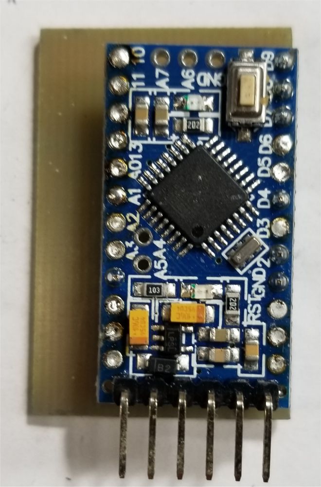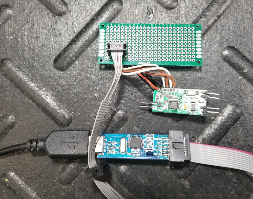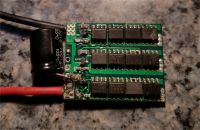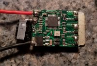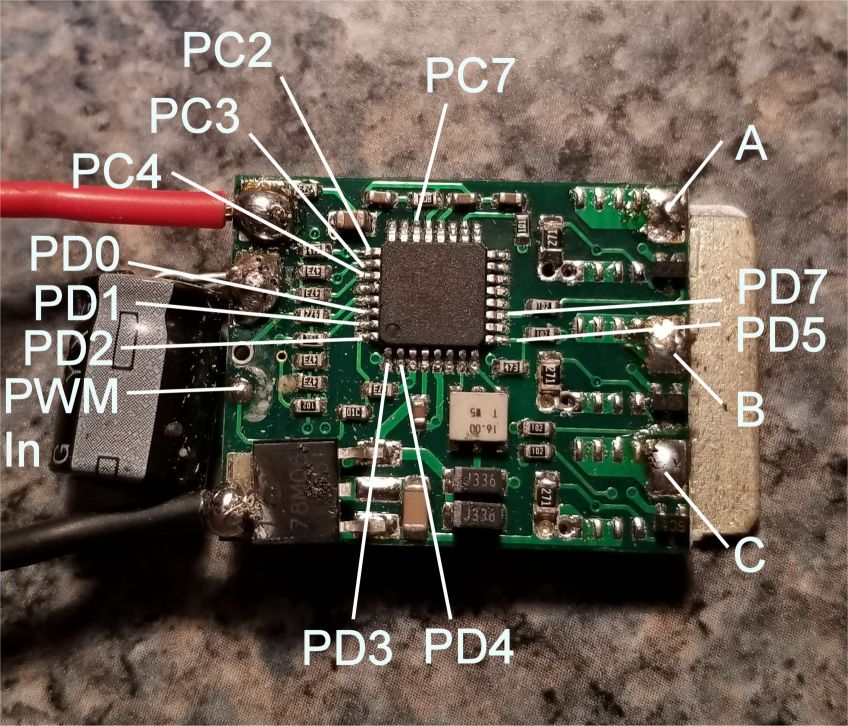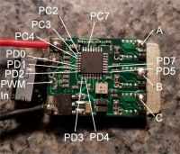 There are several version of this ESC, with two different combinations of FETs: pFETs + nFETS, or just nFETs, and different clock sources: 16 MHz external, 8 MHz external, 4 MHz internal. I traced the ATmega8 pinouts to each set of FETs on the Mag8 version that I own, but none of the definition files for the SimonK Mag8 alternatives ( tgy.inc, tgy6a.inc, tgy_8mhz.inc, tp.inc / tp_8khz.inc / tp_nfet.inc) matched these versions of Mag8s that I own for pinout to FETs or the external 16 MHz oscillator present. I figured I would have to make my own definition file and compile a special version of SimonK firmware for my Mag8 ESCs. However, after more searching, I found that the rct50a.inc and tp70a.inc FET definitions matched my Mag8 for pinouts, with the low side FETs inverted for TP70A. Both also specify a 16 MHz clock. The analog input channels (PC2/ACD2, PC3/ADC3, PC4/ADC4) to read the back EMF from each motor phase, the main voltage input (PC7/ADC7), and the PWM input on PD2 also match the connections on this version of the Mag8. The Mag8 ESCs that I have use a separate daughterboard for the 5V BEC, which is three 7805 voltage regulators wired in parallel. I have removed the BEC from these ESCs to save weight, since the 5V supply is not needed for the multi-rotors to which I have installed these ESCs. These photos show the top and bottom of the ESC with the 5V BEC daughterboard removed.