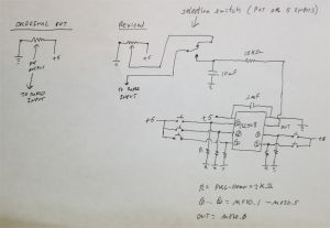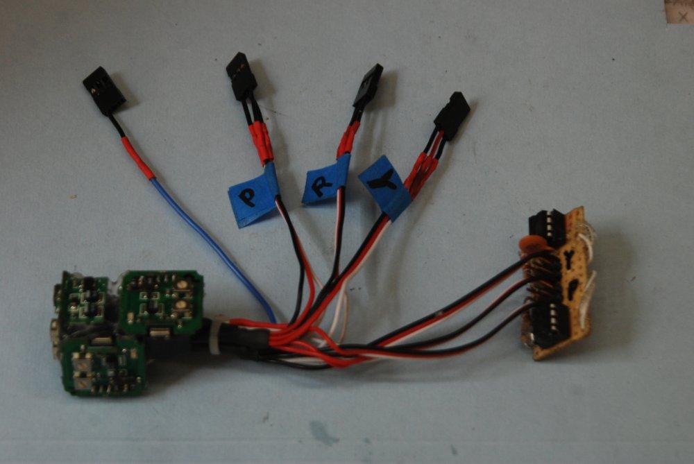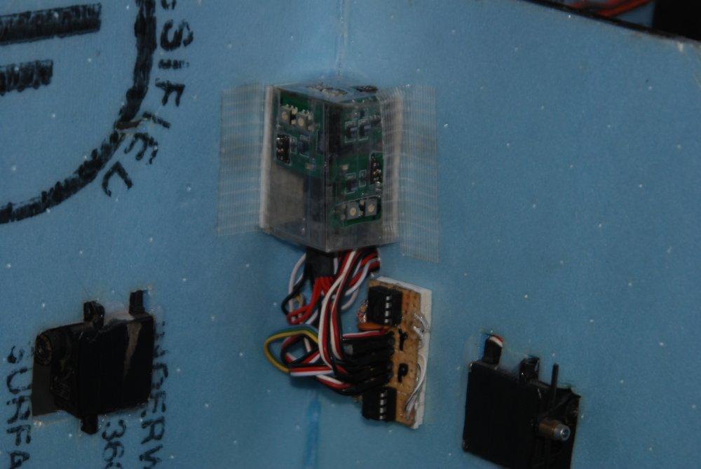 Three HK 401B gyros were taken apart, removed from their original boxes, and hot-melt glued together into a smaller package with each gyro rotated to the correct angle for its sensing axis. Gyro #1 senses roll, gyro #2 senses pitch, and gyro #3 senses yaw. The outputs of each gyro is routed to mixers. The first mixer is used for the horizontal control surfaces, for roll and pitch. The second mixer is used for the vertical control surfaces, for roll and yaw. Rx aileron output --> roll gyro --> roll stabilized PWM roll stabilized PWM + pitch stablized PWM --> mixer #1 --> left