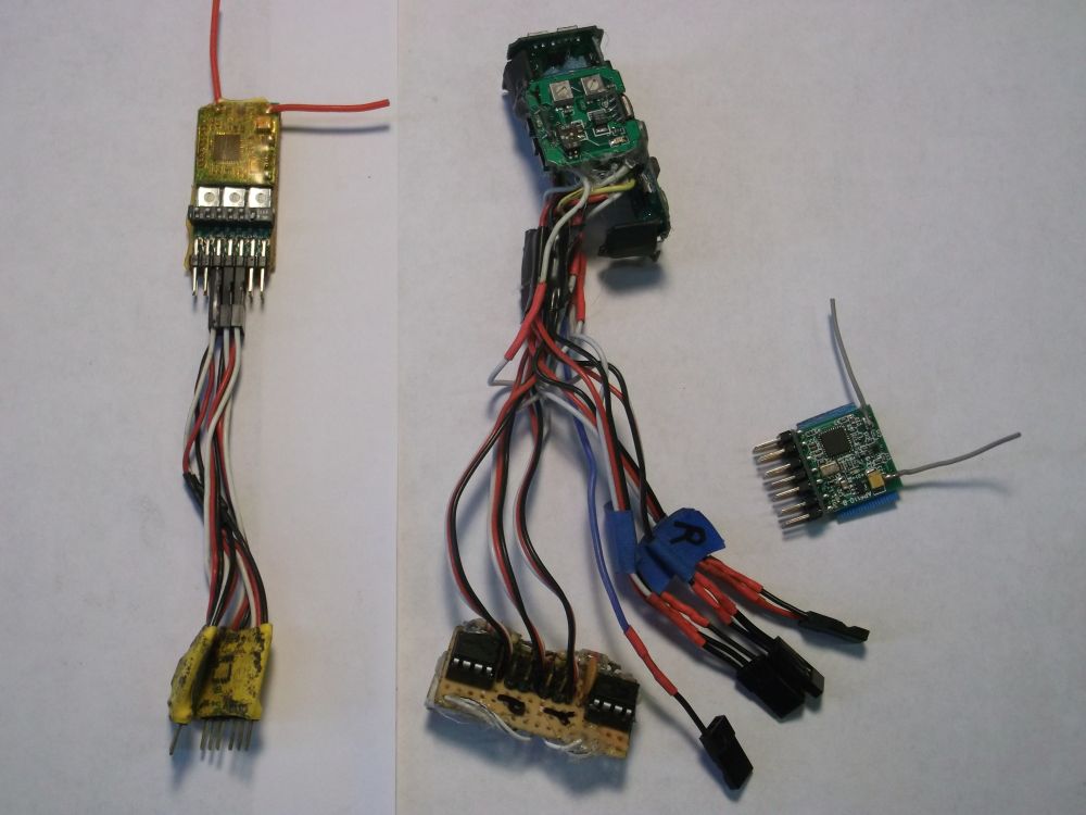 A final, smaller version of stability was completed on both NightOwl #4 and #5 via the use a 3-axis gyro stabilized receiver from Hobby King. The outputs of the receiver, already having gone through the receiver's internal gyro on each axis, are fed into the same commercial mixers originally used for NightOwl #5. Because all three internal gyros are already on the same timing circuit, no additional modifications are needed. This reduced the components from (receiver + 3 gyros + 2 mixers + special wiring : on the right in photo #2) to (receiver + 2 mixers + less wiring : on the left in photo #2). If you want to build a similar aircraft with three control surfaces (two elevons and a single rudder), as NightOwl's #1 through #3 were configured, you could even eliminate the 2 mixers, as the 3-axis stabilized receiver has the built-in ability to control elevon aircraft. |