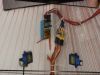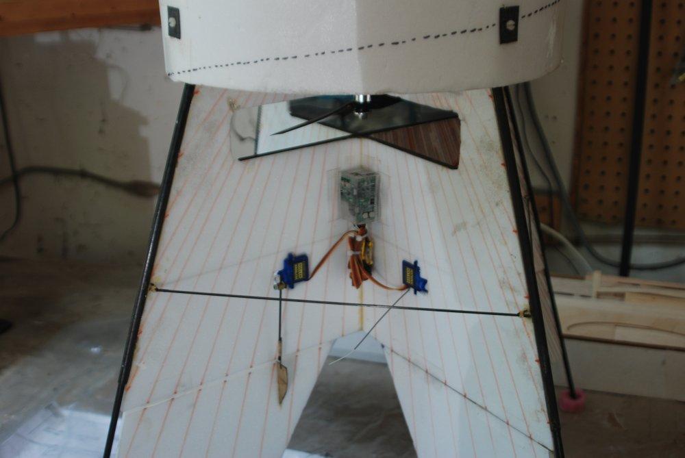 NightOwl versions 4 and 5 each have a 3-axis rate gyro stabilizer. There are four control surfaces on each NightOwl. Two horizontal surfaces move together and control pitch. Two vertical surfaces move together and control yaw. All four surfaces move together and control roll. The gyro stabilizers installed to versions 4 and 5 of the NightOwl are made from disassembled HK 401B rate gyros. These photos shows the gyro and mixer setup for NightOwl version 4. |
