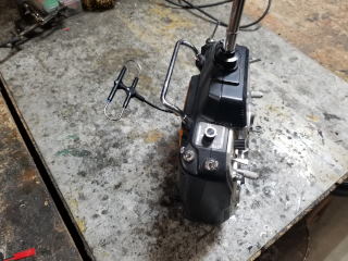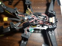 I then used the Draganfly board and the converters to drive brushless ESCs and motors on a home-made quadcopter of similar size to the Draganfly. This worked fine electronically, but the gains were vastly different between the original brushed Draganfly setup and the brushless setup of the new quadcopter. A modification to the code in the PIC converters would allow variable gains (scaling of 0 μs - 5500 μs --> 1000 μs - 2000 μs) via a separate PWM input, but I have not gone back to make that addition to the code yet. It is still something to be done when I have the time. The original Draganfly board and converter board with four PICS, mounted to a simple frame, is shown the first photo. The original Draganfly frame with its brushed motors, and the new brushless motor frame with the adapted electronics is shown in the second photo. |
