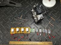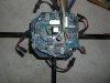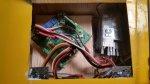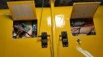 NightOwl version 5 was actually the first NightOwl to receive stabilization with gyros. Because of the inherent slight variability of the timing circuits in all gyros, the use of three HK 401 gyros meant that the input to the mixers would slowly walk apart from each other, as each gyro's timer was not EXACTLY the same as the other gyros. The timing oscillator output on one gyro was connected to the other two gyros, and their timing oscillators were disconnected and overridden. This kept all three gyros on the exact same timing, and allowed the output of the gyros to be connected into two standard commercial mixers, which are the yellow objects in the photo. |