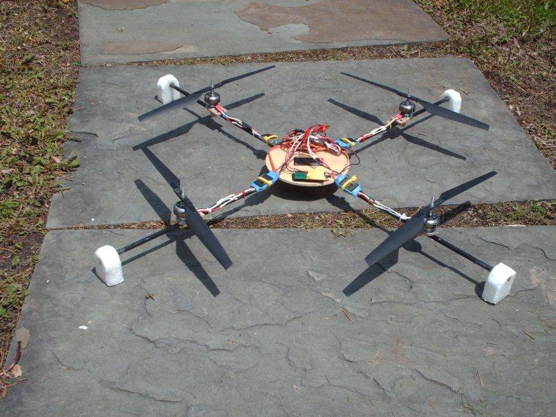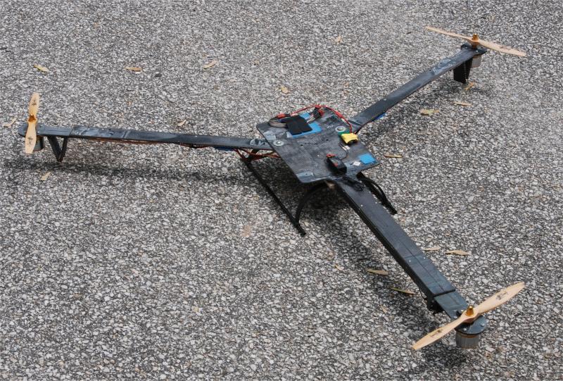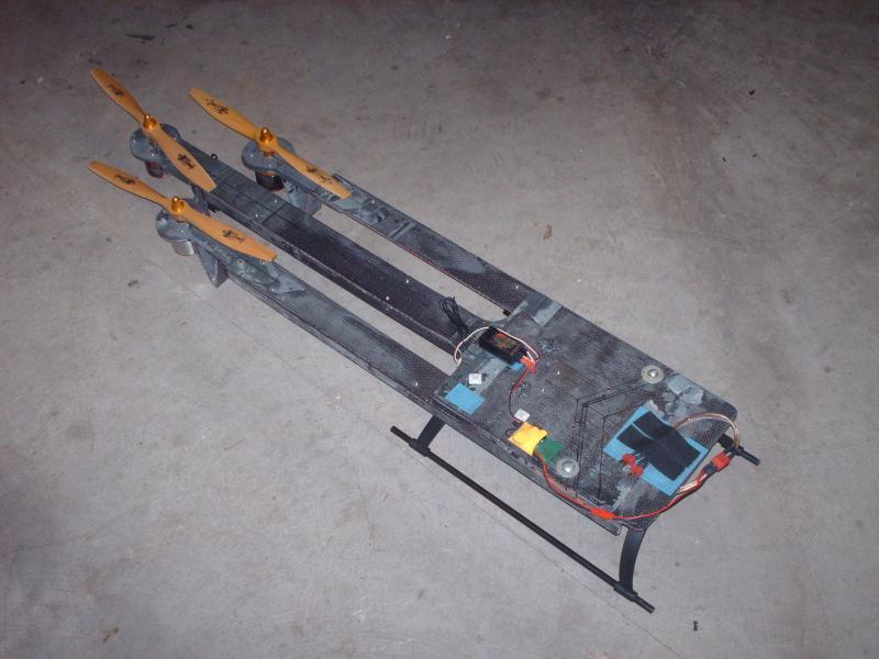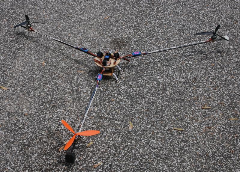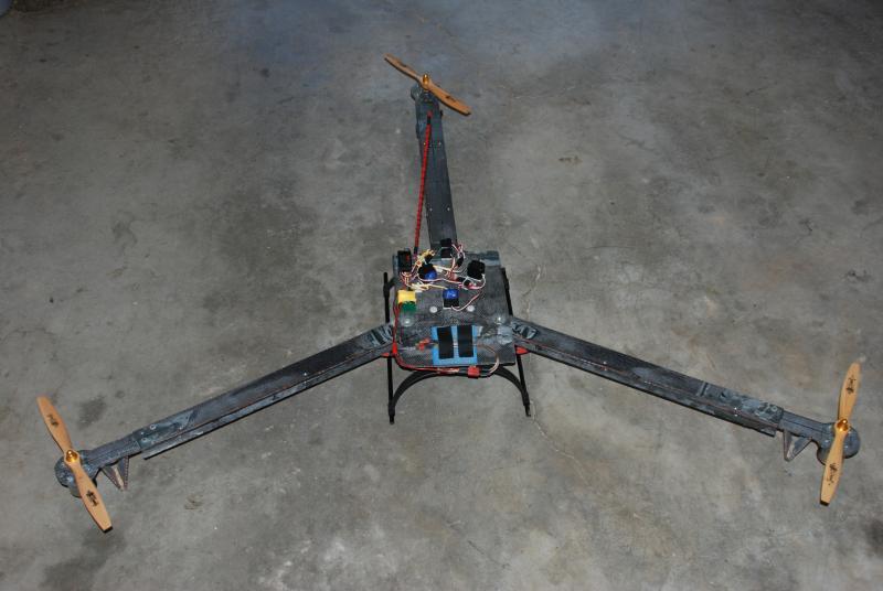 Big TriCopter: Folding carbon fiber frame and helicopter landing gear. This flies well also, but was kind of scary in a close hover because of the large motors and props. (3x) TowerPro 3520 outrunners and 50 amp ESCs, transmitter CCPM mixing, six channels, 4x HK 401B gyros. FLOWN
