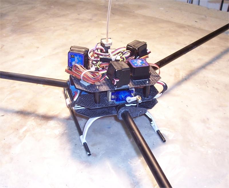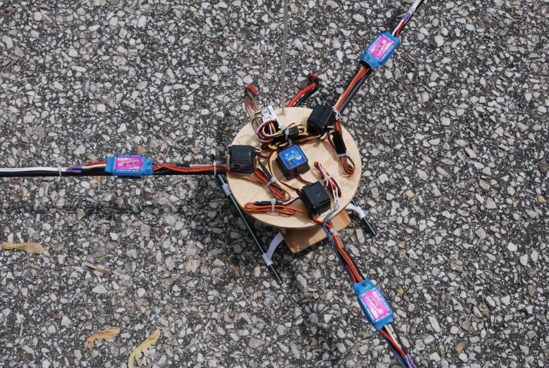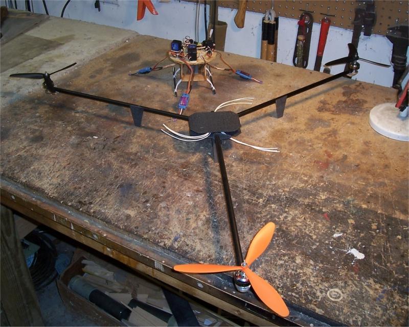 Small TriCopter: I originally built this as a quadcopter, but converted it to 3 motors. This flew well and had a stable hover. It had fixed carbon fiber booms and helicopter landing gear. (3x) 2410-09 outrunners and 18 amp ESCs, transmitter CCPM mixing, six channels, 4x HK 401B gyros. I upgraded this from the wood center section and thin carbon fiber booms to an all carbon fiber center section, thicker booms, and I moved the yaw servo to the center, where it rotated the entire rear boom. This was a much cleaner design, lighter, and stronger. The slightly different boom lengths required the gain on the three primary gyros to be reduced from 35% to 30%. Both versions FLOWN