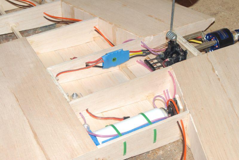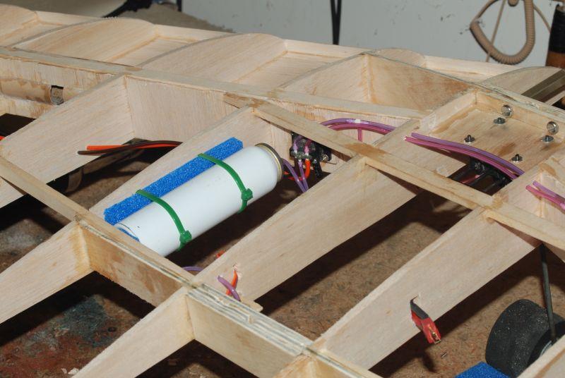 | The center section has now been sheeted. The far bay will hold the motor batteries, the center bay is for the nose retracts, and the near bay is for the retract tank and valve, receiver, and receiver battery pack. The side bays will have covers, with the battery bay getting air vents to keep the batteries cool. | |