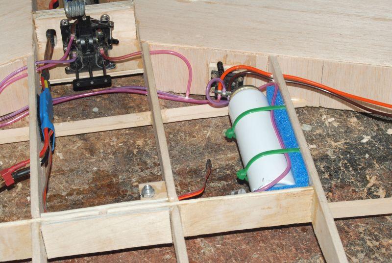 | I have installed the pneumatic retract air system. You can see the air tank, valve switch, fill port, nose retract, and brushless ESC. | |