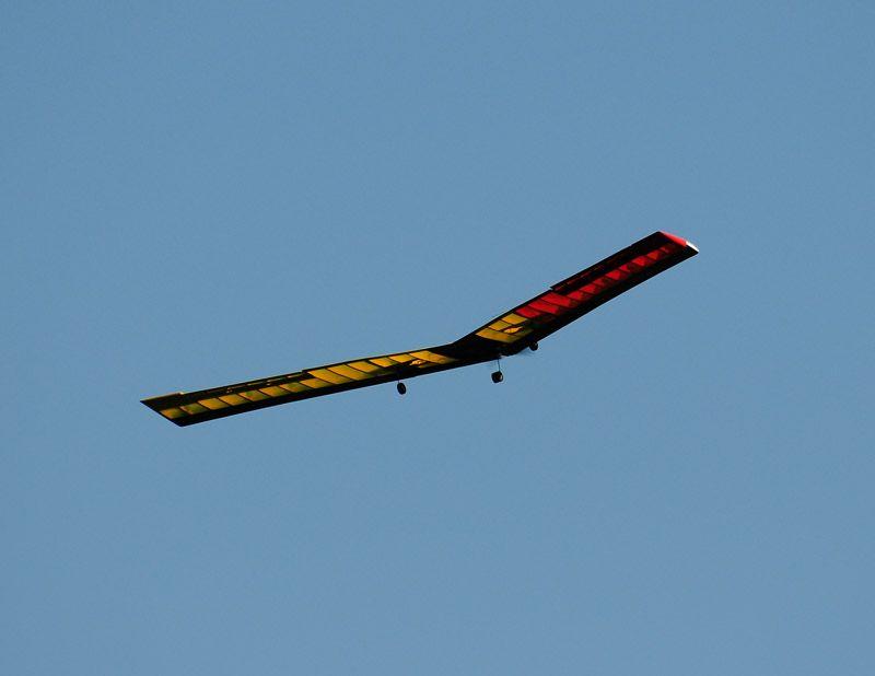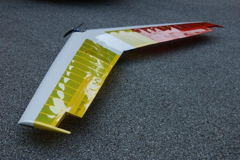 | ... and its down. This wing has a bit more adverse yaw in turns than my previous flying wings; I probably put too much washout into the wingtips. It is easy to fly and land and the bright colors are pretty in the air. | |