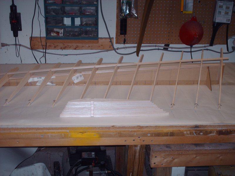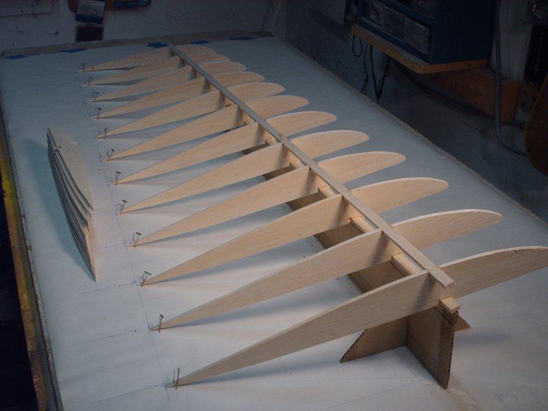 | The wing is built on a jig to ensure the proper washout. This photo shows the left wingtip. The first step is to pin the ribs trailing edges to the building board and glue the spars into the spar slots cut into the high point of each rib. For the wing tips, I use 1/4"x1/2" balsa for the spars, with 1/16" shear web. | |