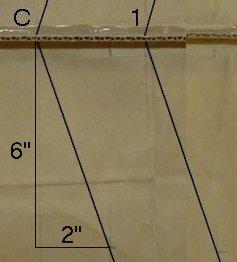 | The angle that each rib is attached to the main spar was calculated with the chord of each wing rib to give a leading edge sweep of 20 degrees and a trailing edge sweep of 8 degrees. These angles, combined with the calculated span gives a total surface area of 1200 square inches to the last wing rib. The rounded wing tips on the prototype add a few square inches to the total. To achieve the same sweeps I have in the wing, draw a line straight out from the jig 6 inches. Turn 90 degrees and go 2 inches. Draw a line from the jig to this point and you have the correct angle to place each wing rib on the main spar as each wing half is constructed. | ![]() |