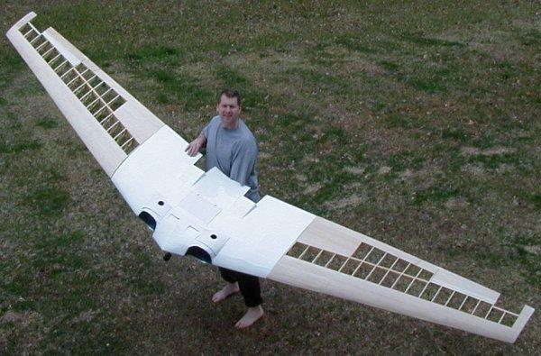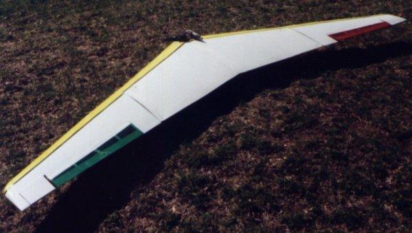 This was an 8 foot wingspan (1/2 full scale) prototype aircraft built to show that the proposed airframe is flight worthy. It was a semi-scale Northrop N-9M flying wing. It crashed in June 2002. This aircraft had these modifications from a true N9M: