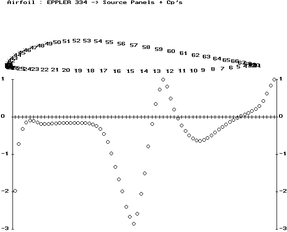 The left image is a cross section of the Eppler 334 airfoil. I chose the Eppler 334 for two main reasons; it was designed specifically for flying wings with no tail surfaces, and it has the highest coefficient of lift at low Reynolds numbers in the Eppler flying wing airfoil series. The right image is the graphical output of my Panels program which uses the source panel method to determine pressure coefficients of any airfoil. It is a thumbnail, so click on it to see the full size image. The source panels method sets up a system of equations that relates the geometry of each separate section to a pre-determined angle of attack, taking into account the entire airfoil and all the surfaces nearby. Those other surfaces may be another airfoil, such as in abiplane or canard configuration, or a flat surface like the Earth to determine ground effect. Click here to see the system of equations that Panels created and solved for this pressure coefficient distribution around the Eppler 334 airfoil. This airfoil and others are available from airfoils.zip on my Software Page.