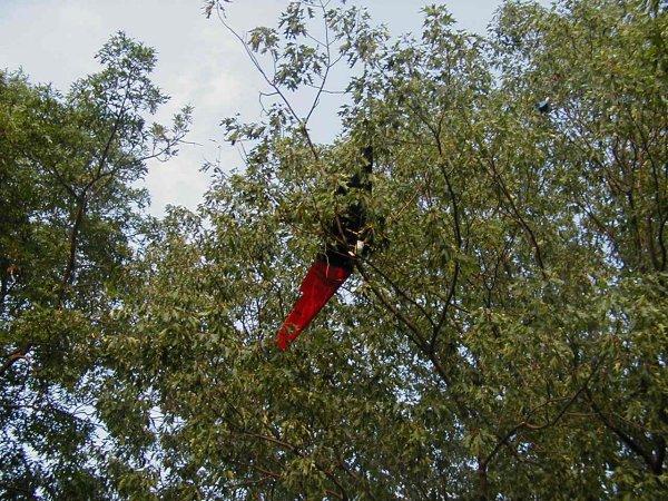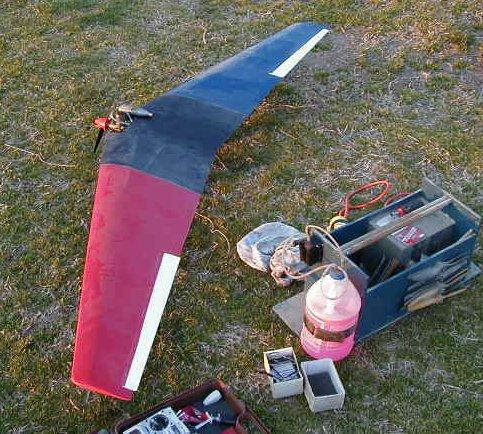 | Jun 2002 Upate: Plane go boom! I'm not quite sure what happened, but the plane was flying very nicely until it decided to fly away by itself. It was almost as if the elevon servos center points were slowly moving; the plane started to pitch nose down and I add back stick, it returned to level flight but immediately pitch nose down again, I added more back stick until I was finally at full back stick and full up trim, but the plane descended slowly out of straight and level flight under full power into the top of a tree about 1/3 mile from the field. I was trying for an open field and managed to catch the top of the very last tree before the field. It may have been radio interference, but everyone who crashes an RC plane says that. The airframe does fly very well though. |