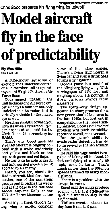 | This big Klingberg Wing is famous. Here is the article that appeared in the Dayton (Ohio) Daily News on 9 June 1991. The image and text are thumbnails; click on them to see full size. |