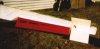 Take a look at these pictures for a better view of the elevons and drag rudders. On the left is full up elevator with the drag rudder closed. On the right is full down elevator with the drag rudder fully open. In addition, a rate gyro is installed in the center of the wing in the yaw axis to help smooth out yaw oscillations.
